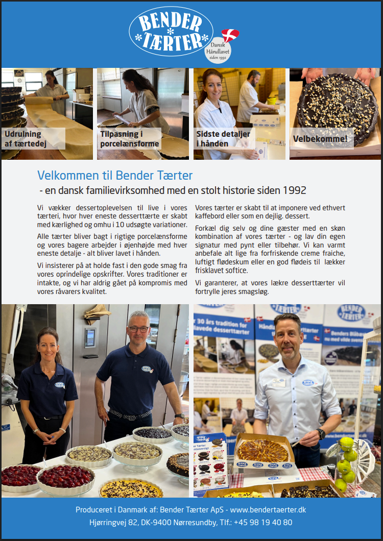Tærterne måler ca. 30 cm. i diameter og kan udskæres i stykker; op til 14-16 personer pr. tærte.